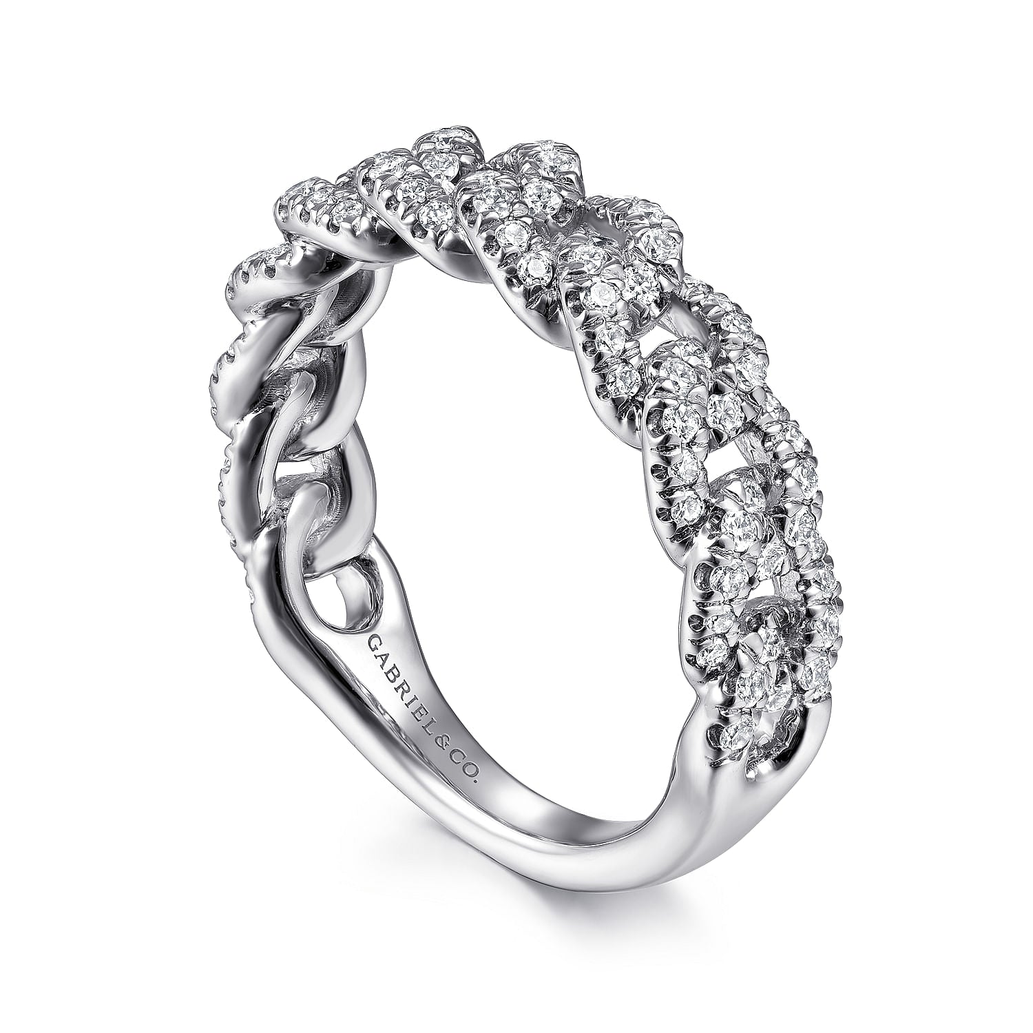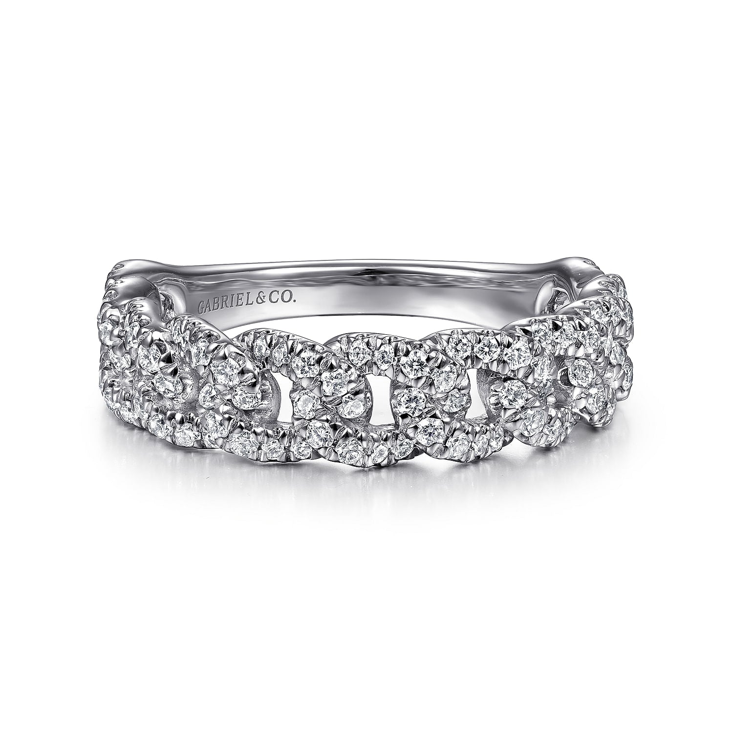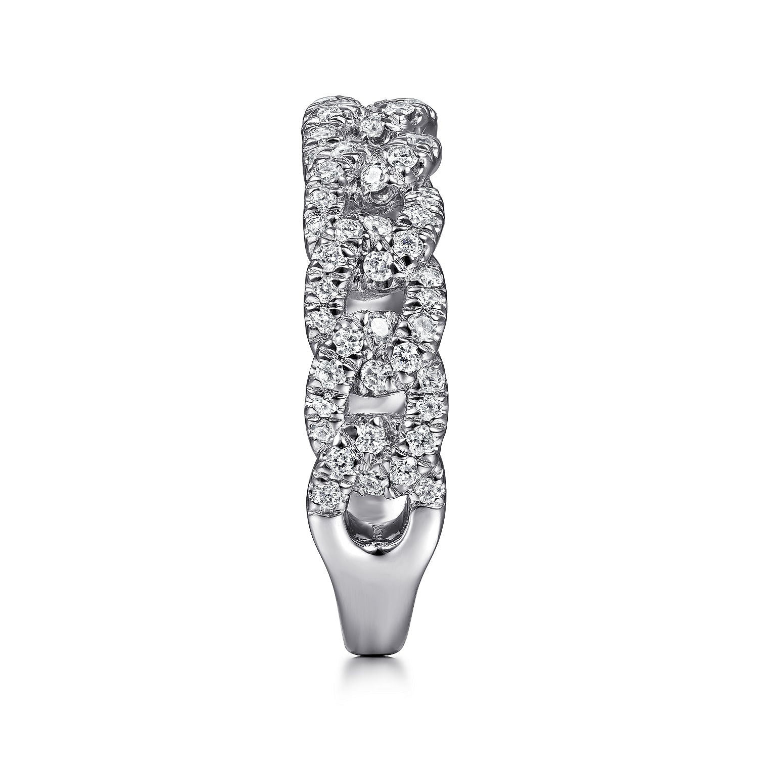 Crafted from exquisite 14K white gold, this stunning stackable ring features a captivating chain link motif. Encircled by dazzling 0.45ct of natural diamonds, this sculpted ring is sure to make a statement and catch the eye of all who see it. Wear it alone or add it to your stack for a truly beautiful look. In-Stock in 14K white gold finger size 6.5 Please call to order other sizes or gold colors.