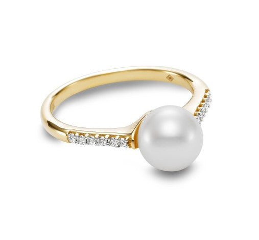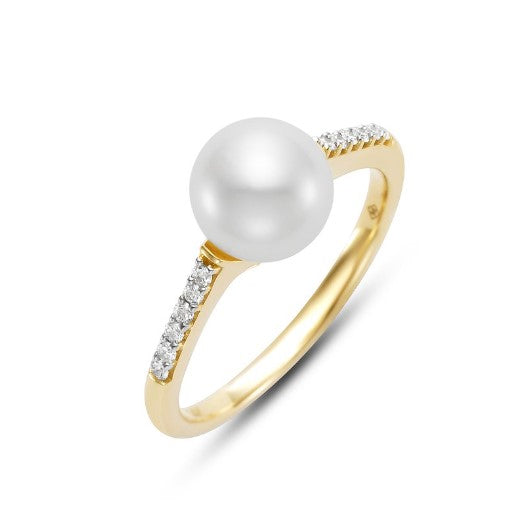 Crafted in the timeless style, this 14KT Yellow Gold ring showcases an 8-8.5MM White Freshwater Pearl and 12 round brilliant cut diamonds totaling 0.10 carats. Elevate your jewelry collection with this stunningly beautiful piece.
