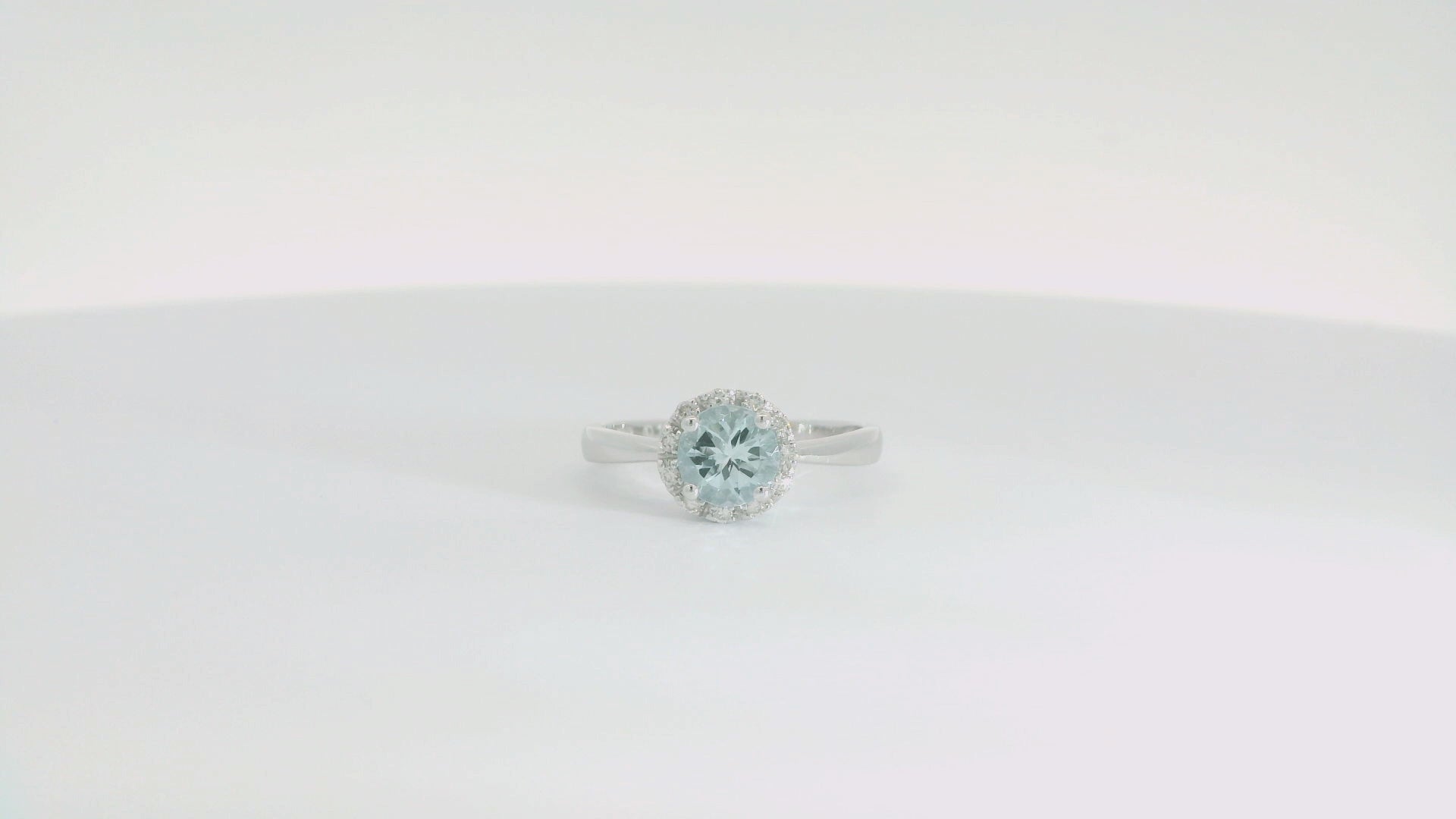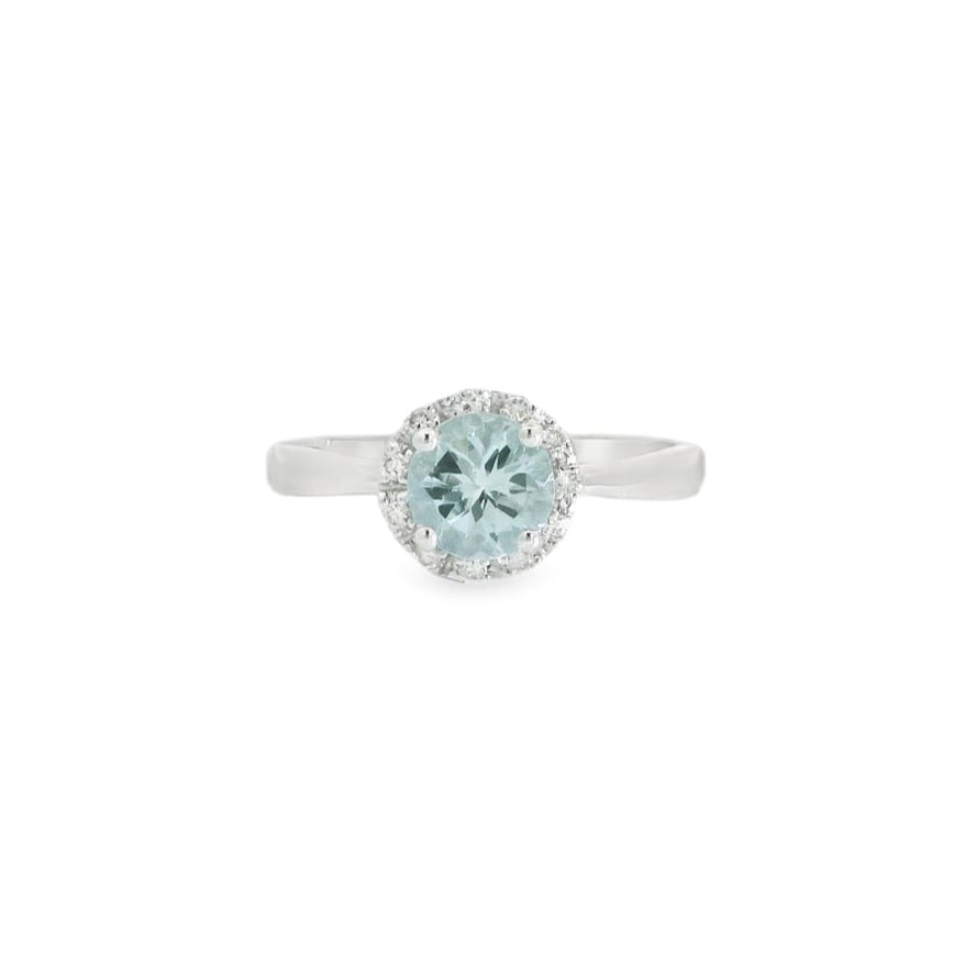 Crafted from 14K white gold, this exquisite ring showcases a stunning .75-carat aquamarine gemstone, known for its captivating blue-green hue and clarity. Surrounding the aquamarine are natural diamonds totaling .10 carats, adding a refined sparkle that enhances the overall elegance of the piece. Designed with expert craftsmanship, this ring offers a timeless combination of color and brilliance, making it an ideal choice for those seeking both sophistication and enduring beauty in fine jewelry.