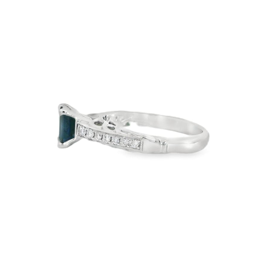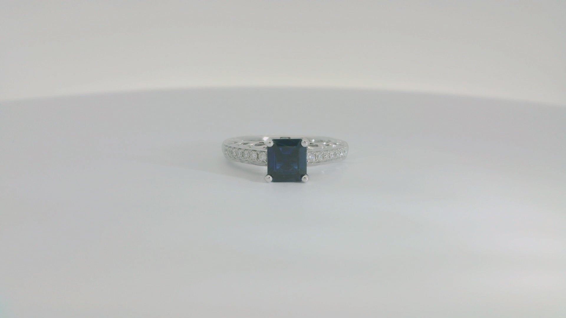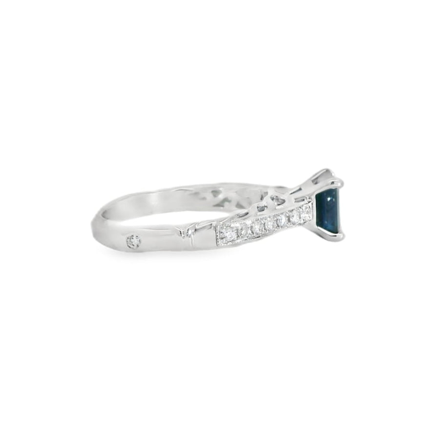 This elegant ring features a 1.23-carat deep blue sapphire in an emerald cut, set on a white gold semi-mounting that combines refined elegance with modern design. It is accented by natural diamonds totaling 0.15 carats, enhancing its luxurious appeal.