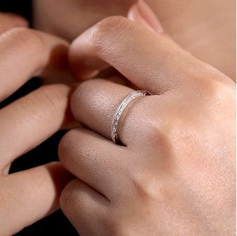 A dainty stackable ring crafted from 14K white gold with two rows of elegant milgrain detailing. The profile of the slim, straight band is adorned with eye-catching chevron engraving. A versatile style to incorporate into your stackable ring collection. Gabriel & Co. # LR4930W4JJJ