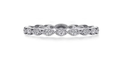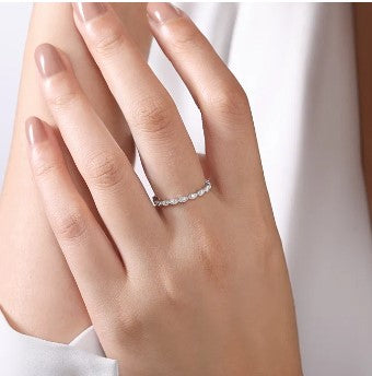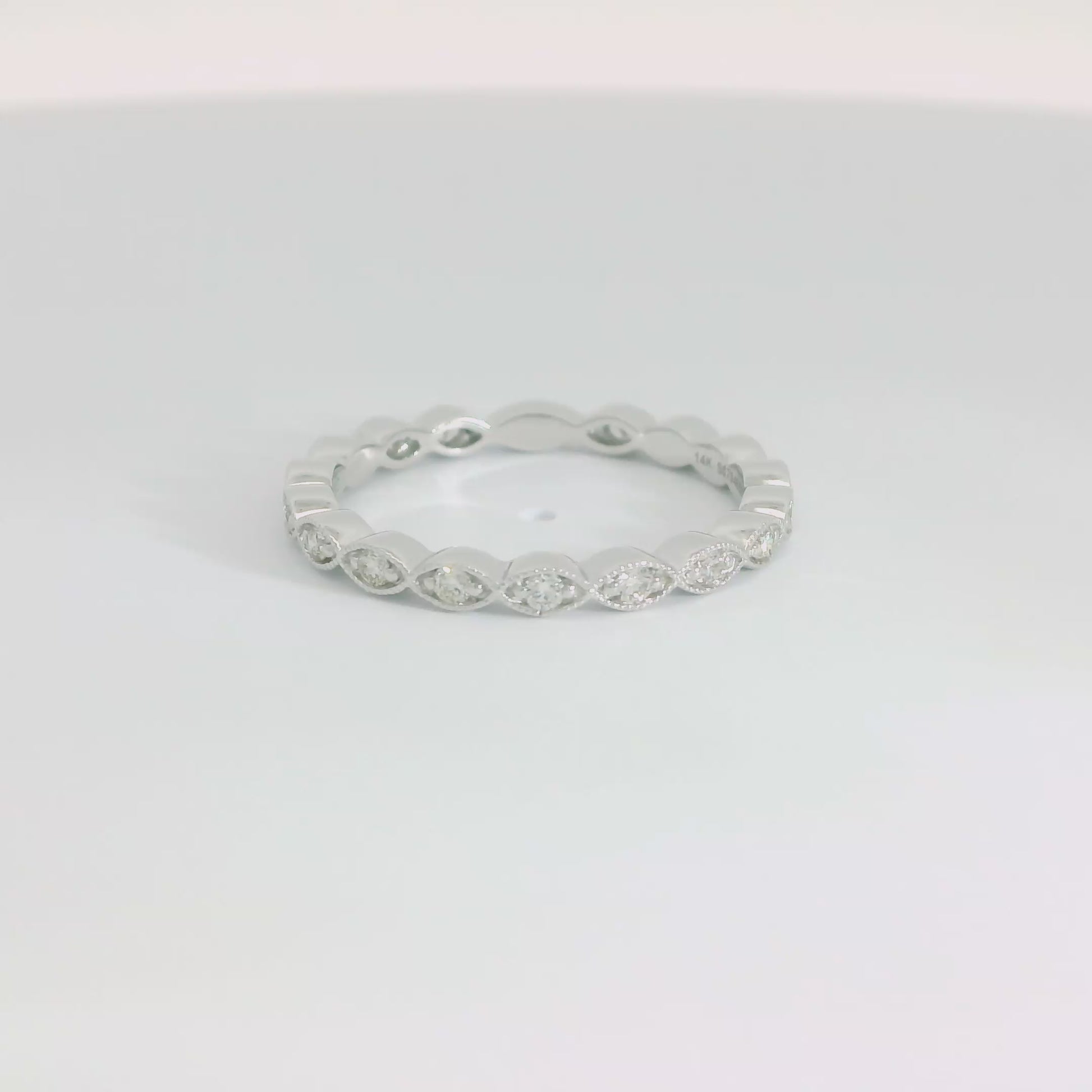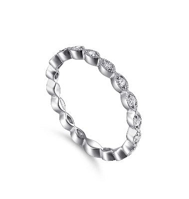 This exquisite diamond ring features a series of marquise shapes set with round brilliant cut diamonds. This delicate band offers both elegance and sophistication. Perfect for any occasion, its timeless design complements any outfit with a touch of sparkle. This beautiful ring can be worn on its own or stacked with other rings. The ring is made in 14K white gold and features 0.25tw of natural round brilliant cut diamonds. Gabriel & Co. # LR4794W45JJ
