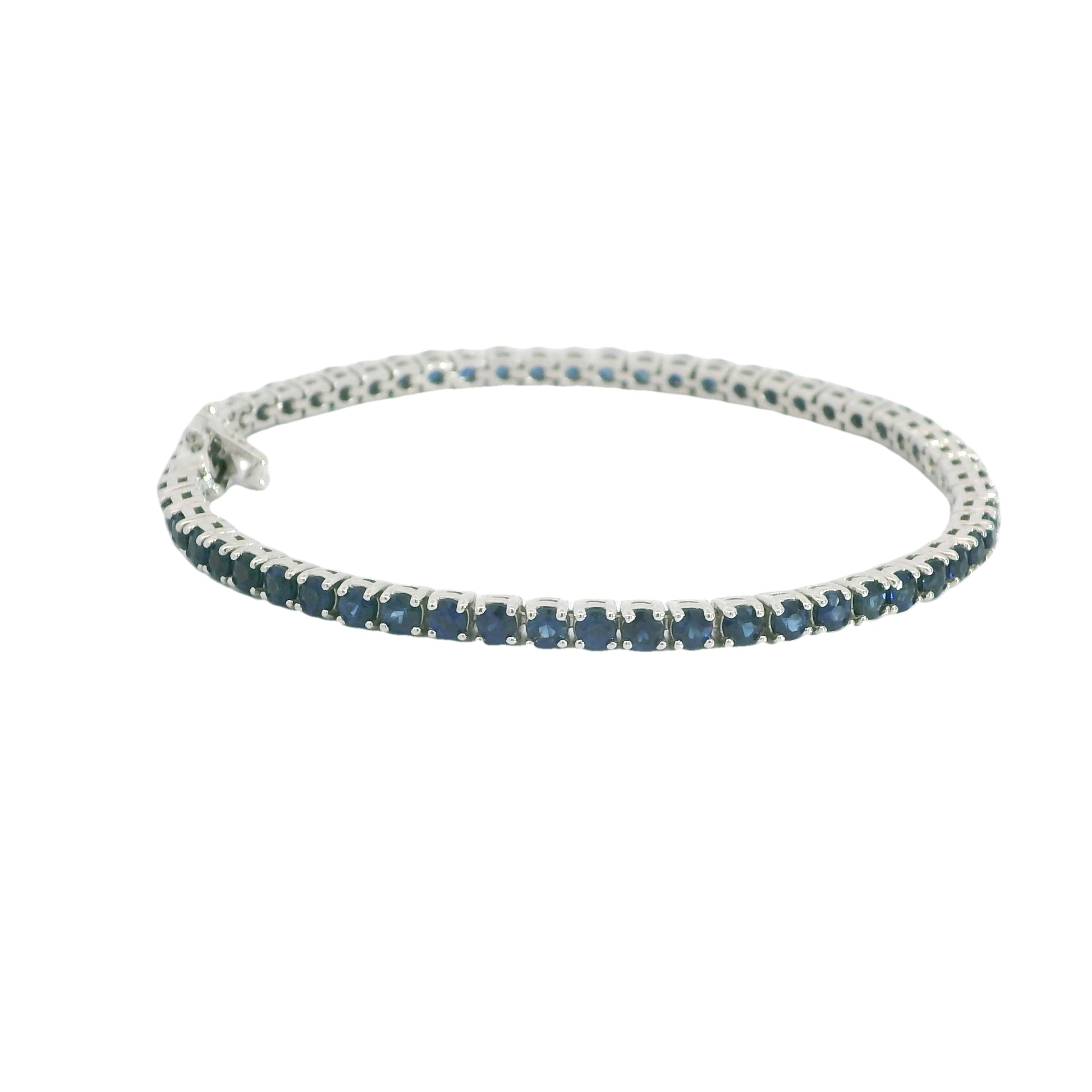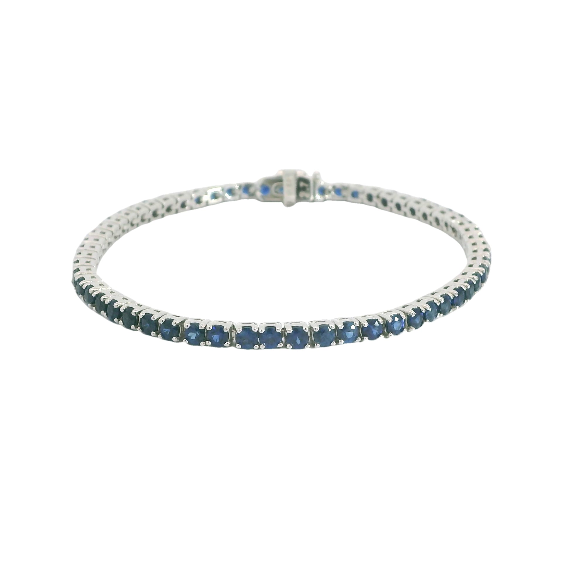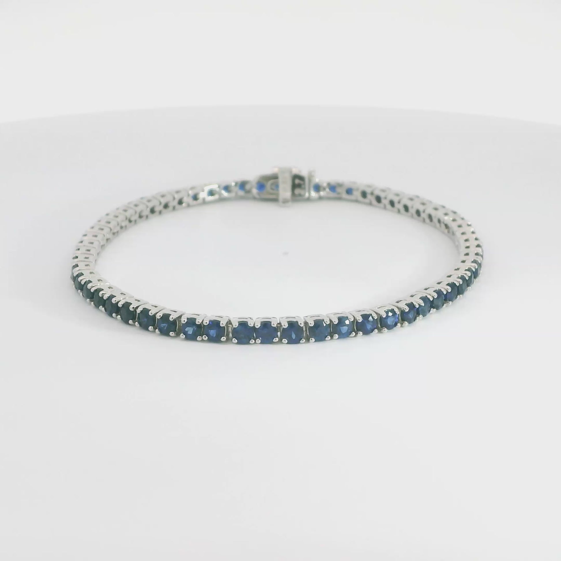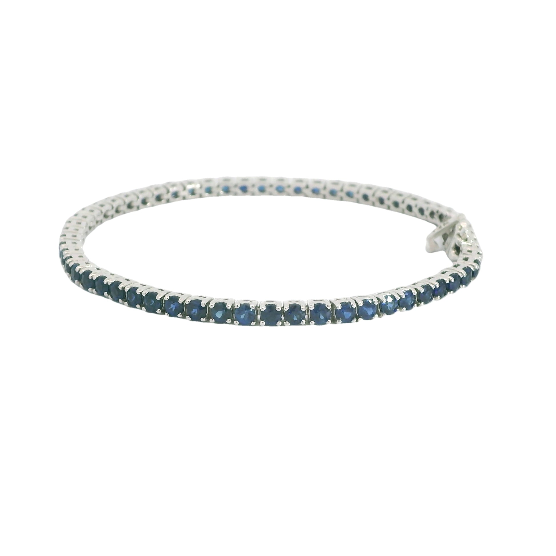 This exquisite bracelet features a stunning array of deep blue sapphires, each meticulously set in a white gold bracelet. Perfect for adding a touch of sophistication to any outfit, this piece is a timeless addition to any jewelry collection. This beautiful 14 karat white gold bracelet features 5.57 carats of diamond cut natural blue sapphires.
