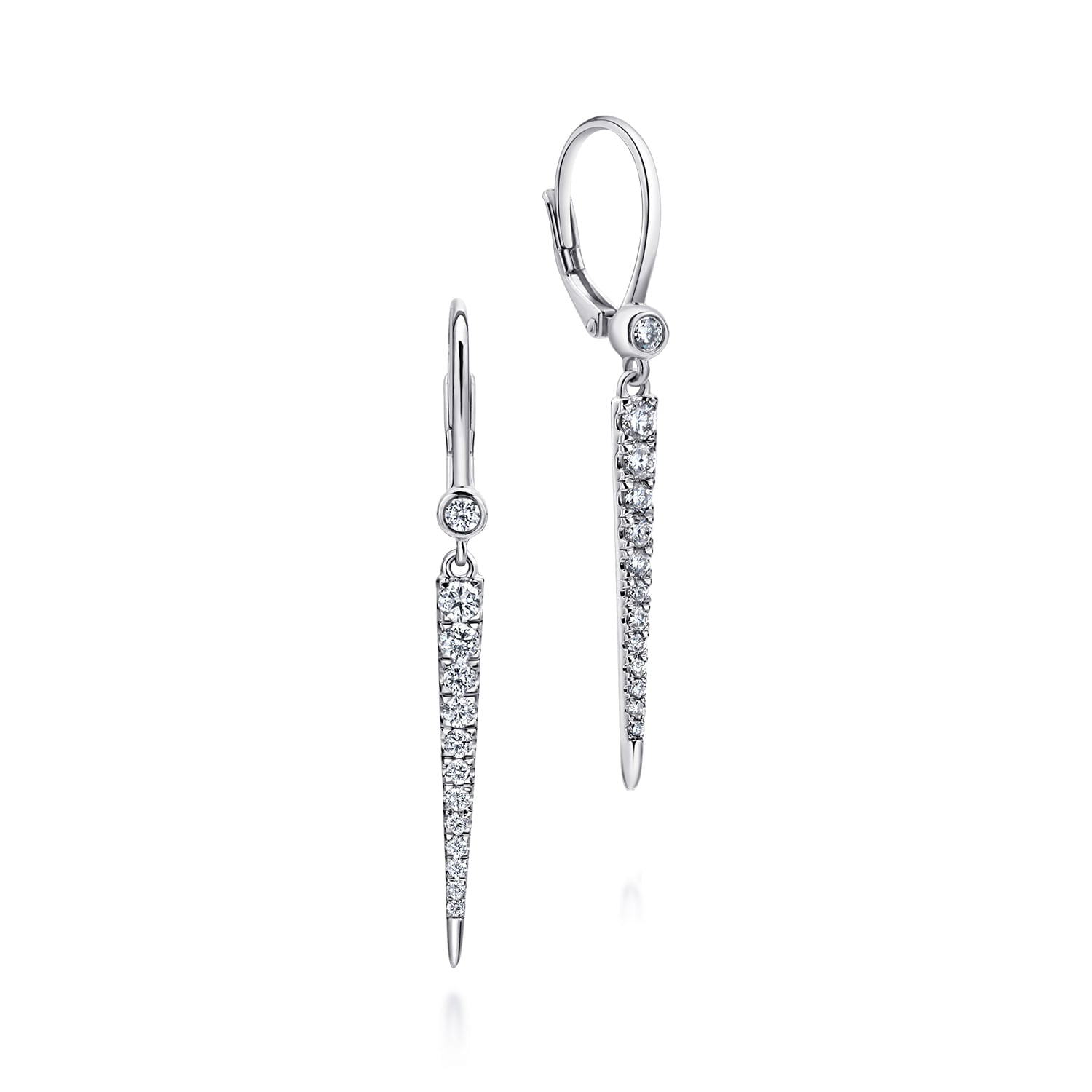 These refined 14k white gold earrings showcase a distinctive tapered diamond design that catches light with understated elegance. Featuring 0.31 carats of precisely set diamonds arranged in a sleek vertical formation, each drop delivers a sophisticated gleam that complements any complexion. The minimalist silhouette offers versatile styling—equally at home with evening wear or elevated everyday looks. A timeless investment piece that balances modern geometry with classic luxury.