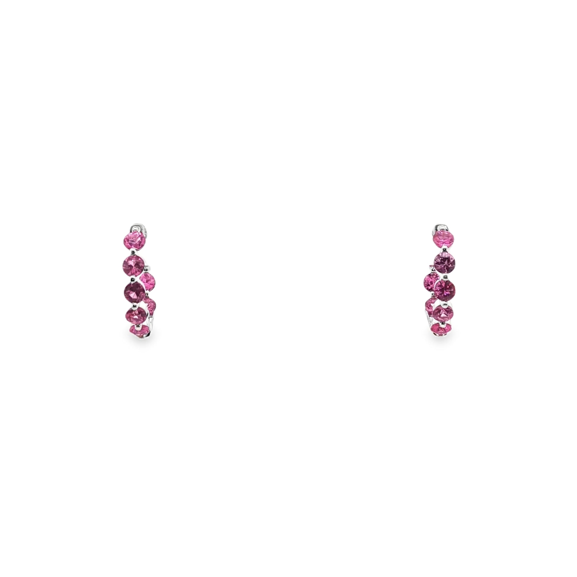 These exquisite hinged hoop earrings showcase a total of 1.82 carats of vibrant pink sapphires meticulously set in 14K white gold. Crafted with an inside-out design, the sapphires are displayed on both the inner and outer surfaces of the hoops, enhancing their brilliance and visual impact from every angle. The refined hinged mechanism ensures secure and comfortable wear while maintaining a sleek profile. Combining expert craftsmanship with elegant materials, these earrings offer a sophisticated statement piece perfect for elevating any jewelry collection.