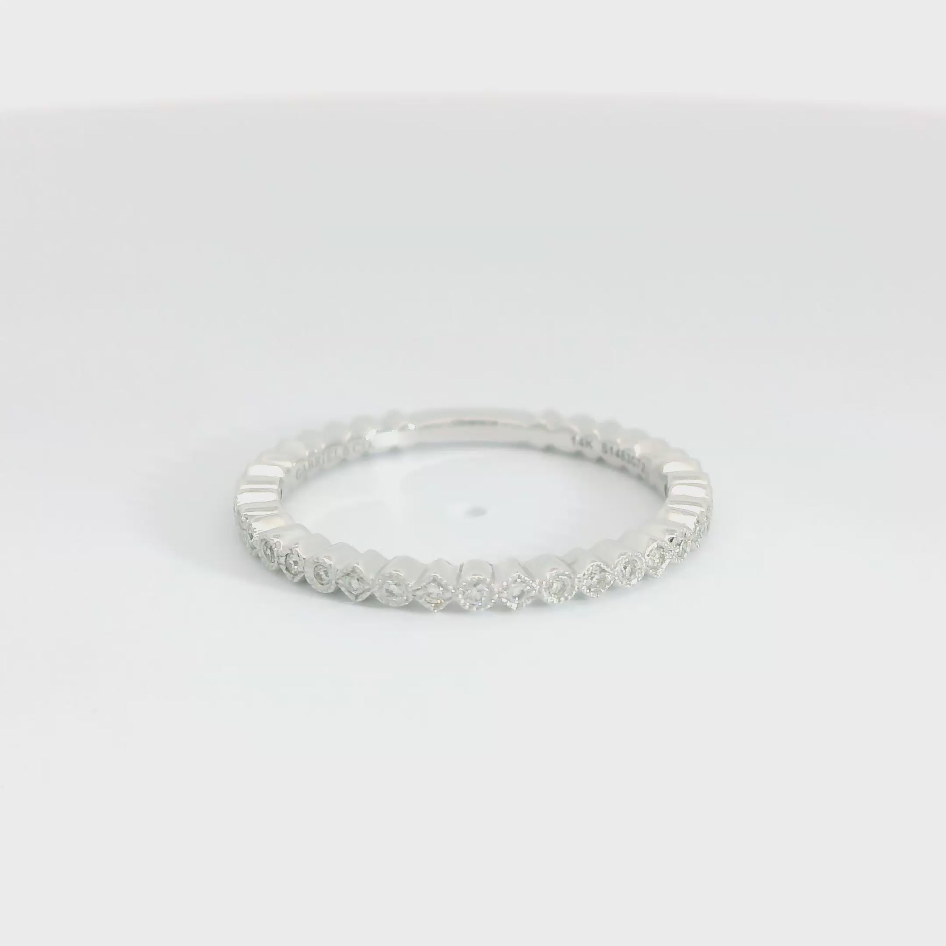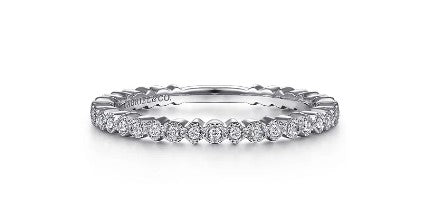 This exquisite diamond stackable band is a timeless symbol of elegance and sophistication. Crafted with precision, each sparkling diamond is meticulously set to create an unbroken circle of brilliance. Perfect for weddings or anniversaries, this ring adds a touch of luxury to any occasion. This beautiful ring can be worn on its own or stacked with other rings. The ring is made in 14K white gold and features 0.13tw of natural round brilliant cut diamonds. Gabriel & Co. #LR4801W45JJ