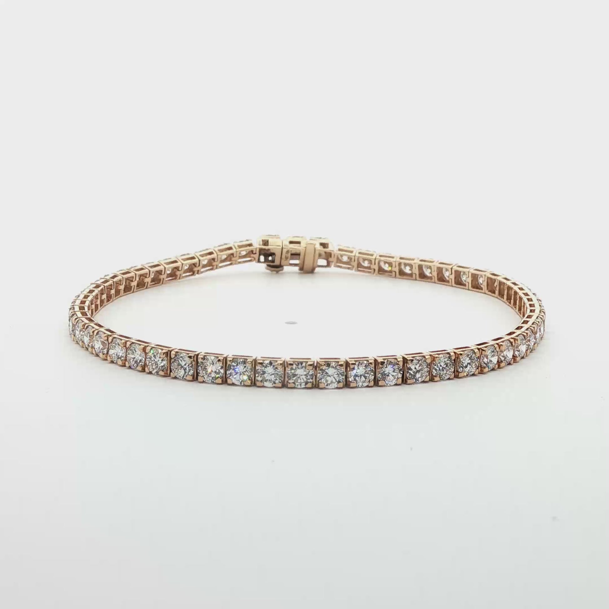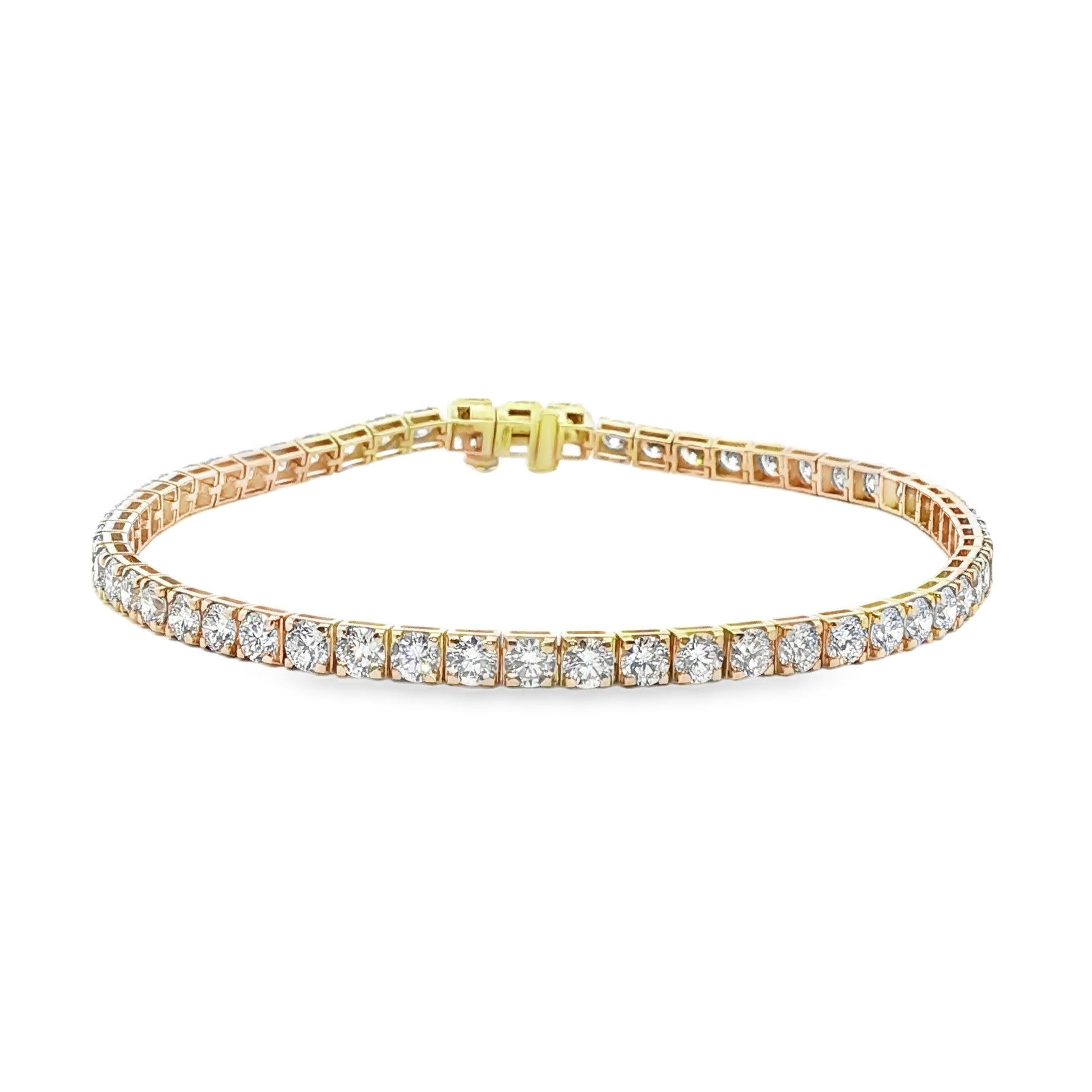 This refined tennis bracelet features a seamless row of sparkling round brilliant diamonds, set in radiant 14K yellow gold. Each diamond is expertly positioned to enhance its natural brilliance and fire, delivering superior light performance. With a total weight of 5.23 carats, these lab-grown diamonds boast VVS clarity and D-F color grades, ensuring exceptional quality. A classic and sophisticated accessory, this bracelet adds a luxurious sparkle suitable for any elegant setting.