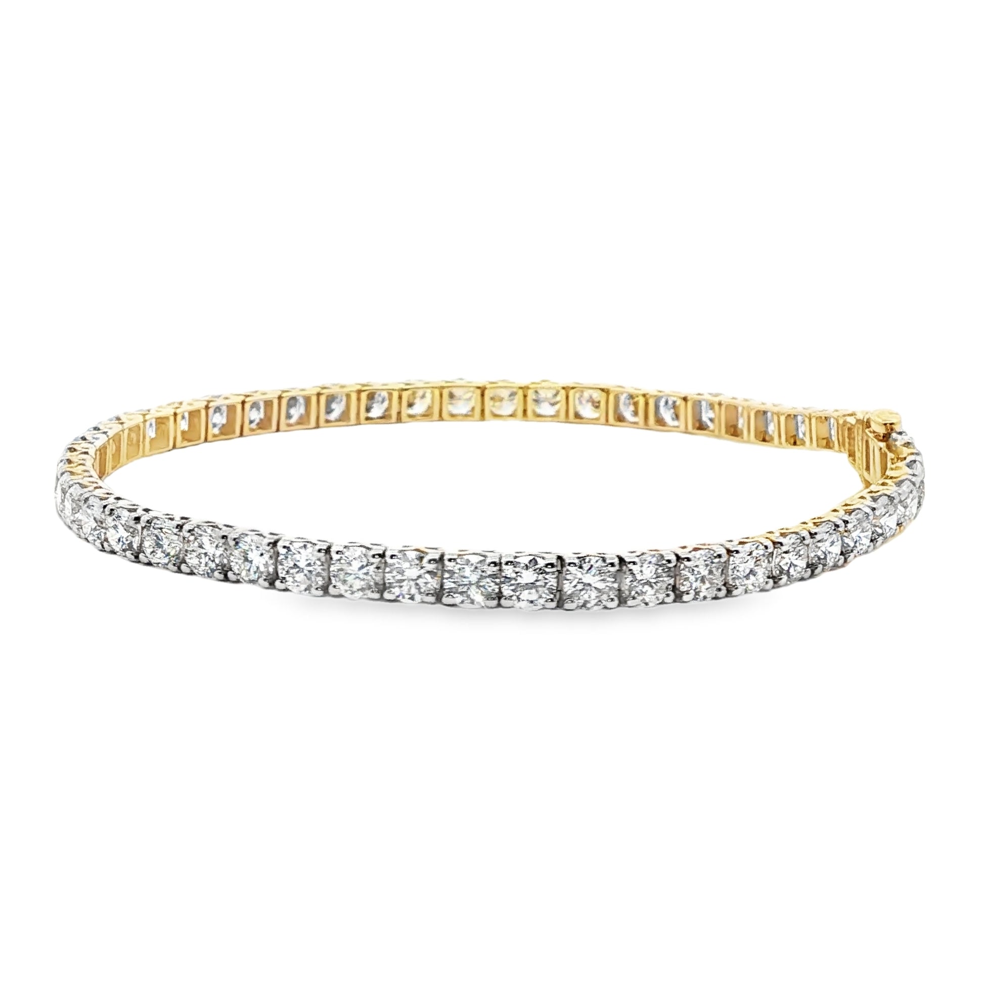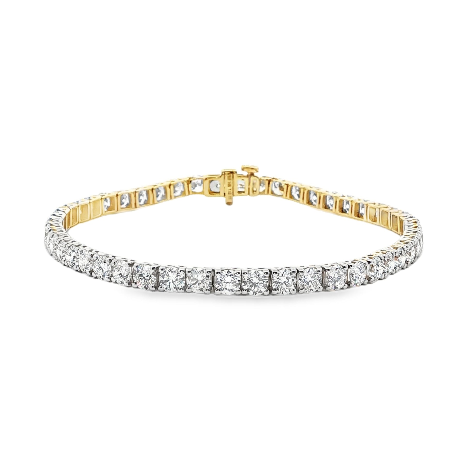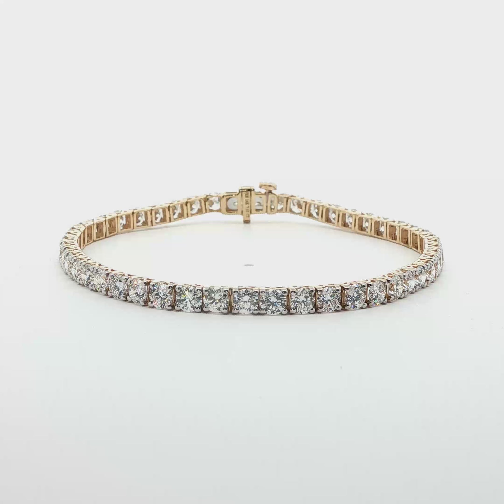 This refined tennis bracelet features a seamless row of sparkling round brilliant diamonds, set in radiant 14K yellow gold. Each diamond is expertly positioned to enhance its natural brilliance and fire, delivering superior light performance. With a total weight of 7.12 carats, these lab-grown diamonds boast VVS clarity and D-F color grades, ensuring exceptional quality. A classic and sophisticated accessory, this bracelet adds a luxurious sparkle suitable for any elegant setting.