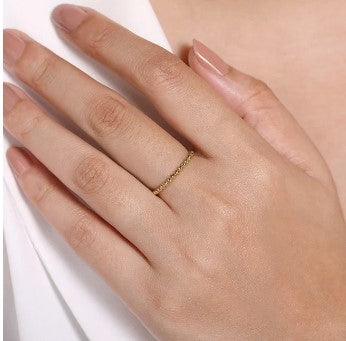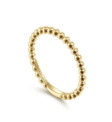 This exquisite gold beaded ring is a testament to timeless elegance and subtle sophistication. Each bead reflects light beautifully, creating a shimmering effect that enhances any outfit. Perfect for stacking or wearing alone, this piece adds a touch of luxury to your everyday style. This beautiful 14K yellow gold ring can be worn on its own or stacked with other rings. Gabriel & Co. # LR51172Y4JJJ