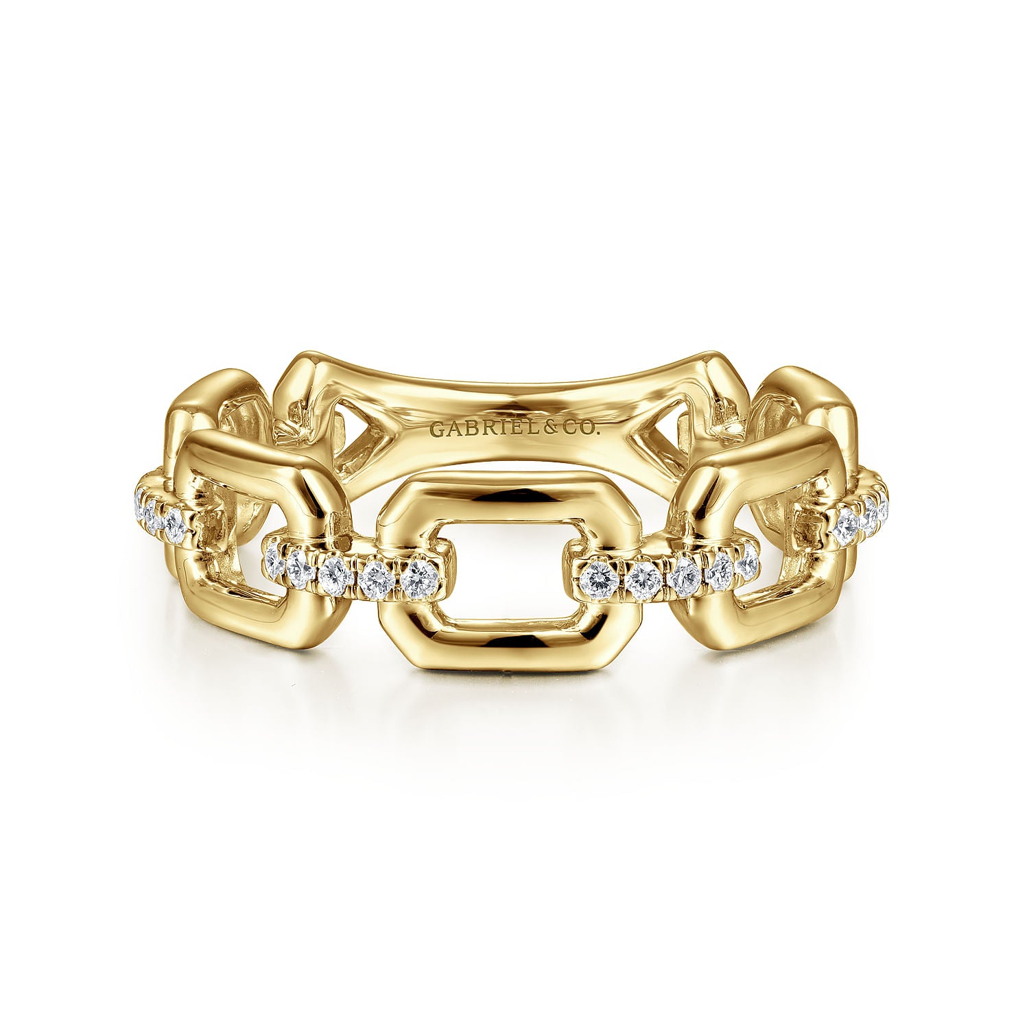 Delicate pavé diamond connectors punctuate polished 14K yellow gold links in this sophisticated stackable ring. Featuring 0.11 carats of diamonds, this refined band seamlessly layers with other pieces for a customized, multidimensional look. The interplay of gleaming gold and sparkling diamonds creates understated elegance that transitions effortlessly from day to evening wear.