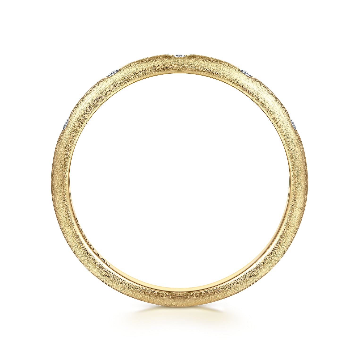 This exquisite 14K yellow gold ring, adorned with delicate diamonds, exudes timeless elegance. Perfect for any occasion, its minimalist design ensures it complements both casual and formal attire effortlessly. This beautiful ring can be worn on its own or stacked with other rings. The ring is made in 14K yellow gold and features 0.04tw of natural round brilliant cut diamonds. Gabriel & Co. # LR52508Y45JJ