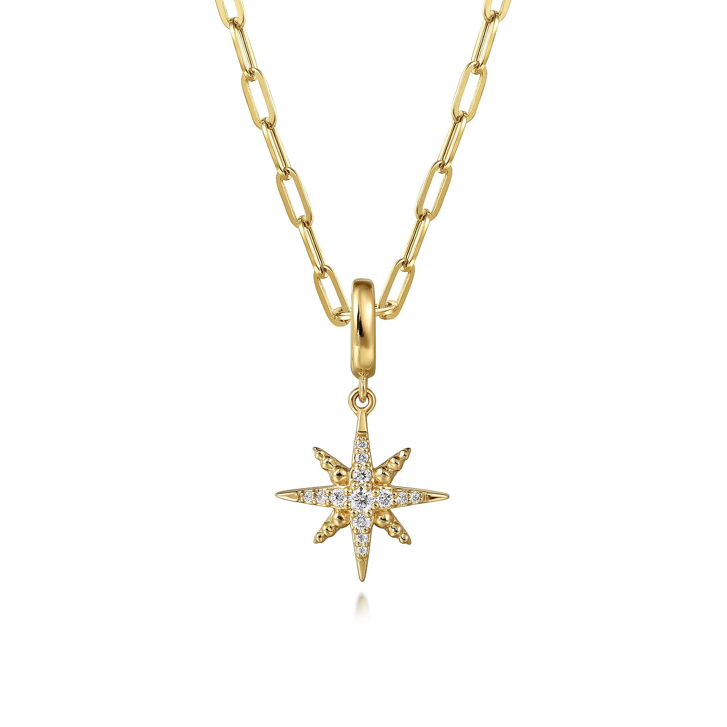 Crafted from 14 karat yellow gold, this star-shaped pendant showcases 0.15 total carats of carefully selected natural diamonds, expertly set to maximize brilliance and sparkle. Its refined design balances classic elegance with a modern touch, making it a versatile accessory suitable for both everyday wear and special occasions. The pendant’s durable construction ensures lasting beauty, while the luminous diamonds add a subtle yet captivating shimmer. Ideal for those who appreciate fine craftsmanship and understated luxury, this piece enhances any jewelry collection with its timeless appeal. Sold without chain.