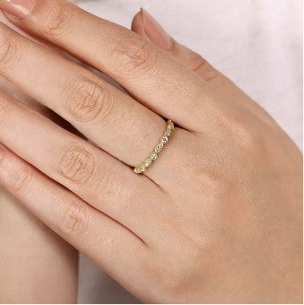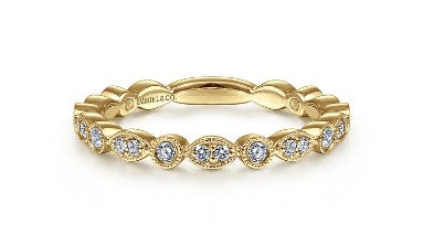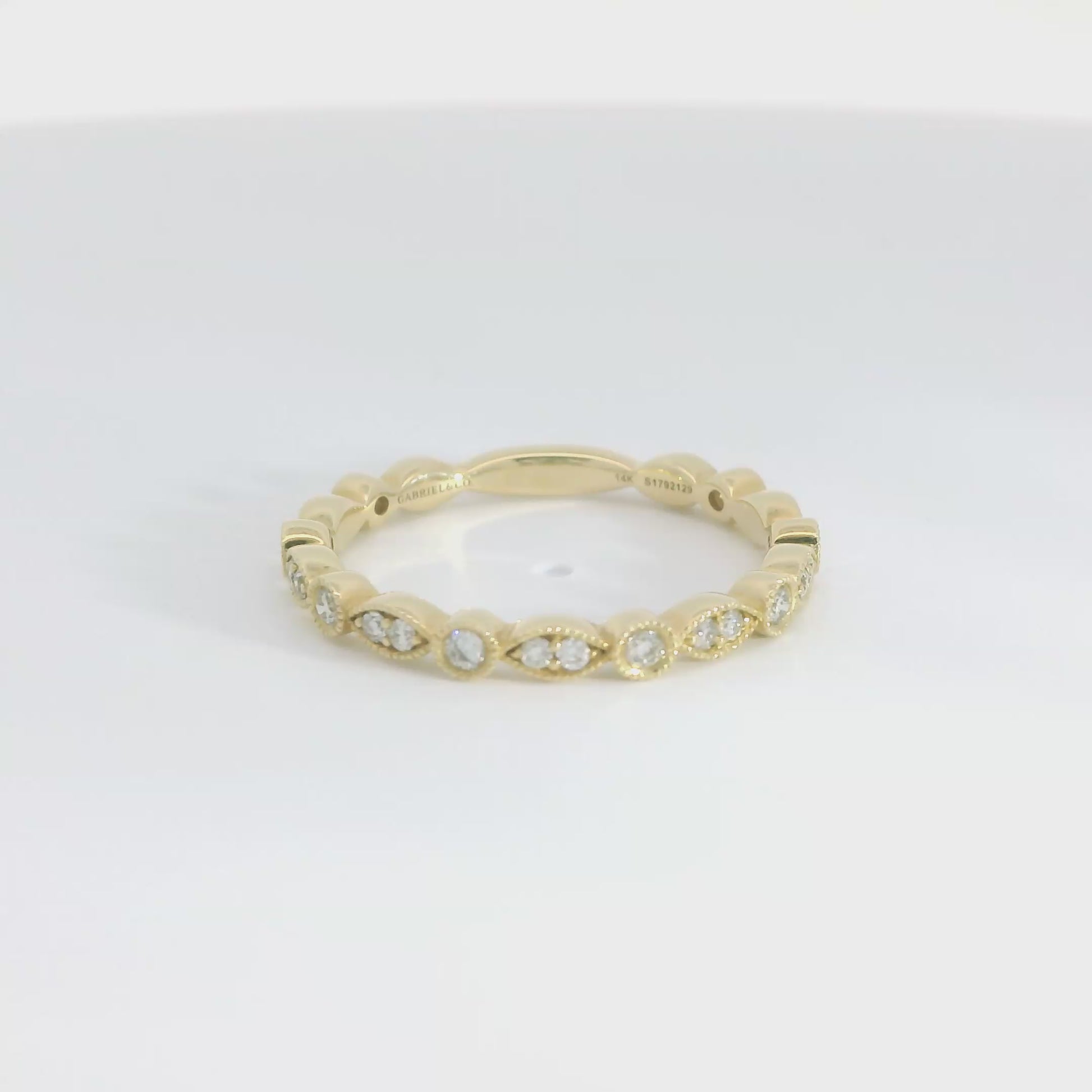 Featuring diamonds throughout the band and charming miligrain edging, this 0.25ct stackable ring is a versatile must-have accessory. The 14K yellow gold band features a scalloped silhouette of alternating round and marquise shapes.This beautiful ring can be worn on its own or stacked with other rings. The ring is made in 14K yellow gold and features 0.25tw of natural round brilliant cut diamonds. Gabriel & Co. # LR5701Y45JJ