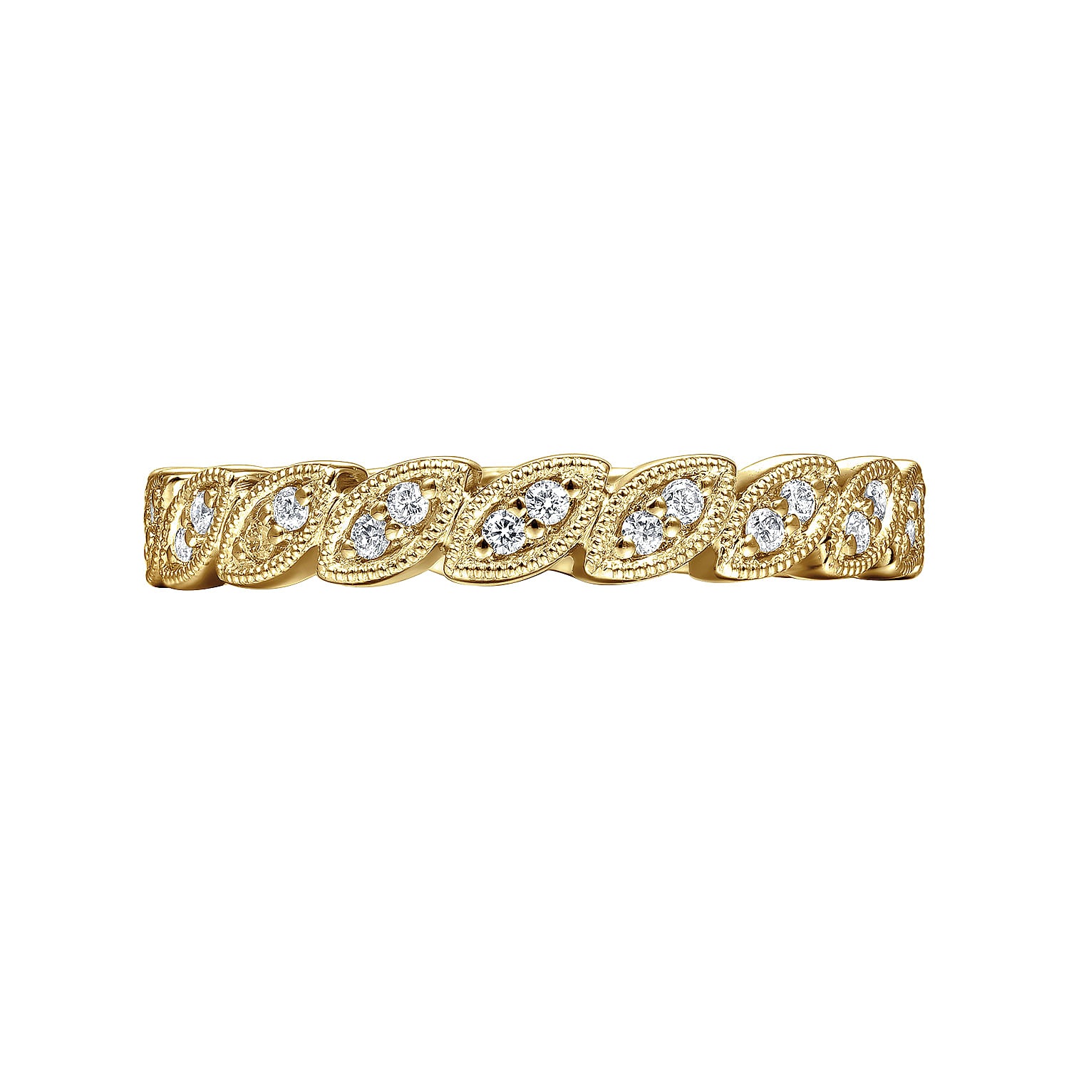 Handcrafted to perfection, this exquisite 14K yellow gold stackable ring features a 0.17ct diamond array dispersed tastefully around the band. The precious round diamonds are prong set within delicate milgrain-edged marquise shapes creating a unique silhouette.
