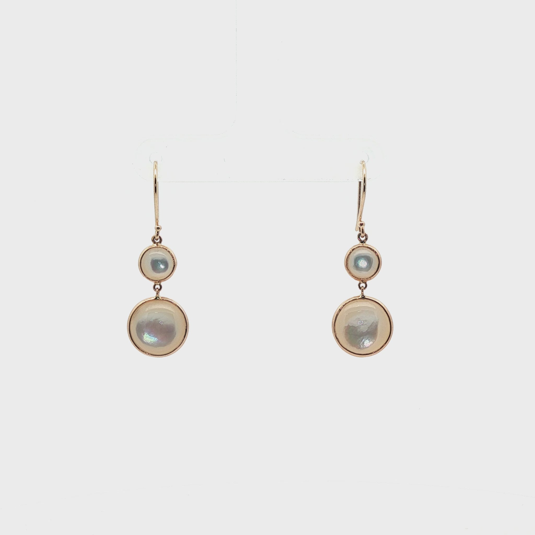 These 14K yellow gold double drop earrings showcase two round 6mm Mother of Pearl pieces positioned above two larger 10mm round Mother of Pearl sections. They are finished with elegant French wire hooks for secure and comfortable wear.