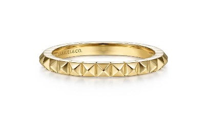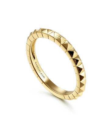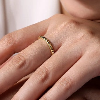 This exquisite gold ring features a series of delicate studs, adding a touch of sophistication and modern flair. Perfect for any occasion, its minimalist design ensures it complements both casual and formal attire effortlessly. This beautiful 14K yellow gold ring can be worn on its own or stacked with other rings. Gabriel & Co. # LR51692Y4JJJ