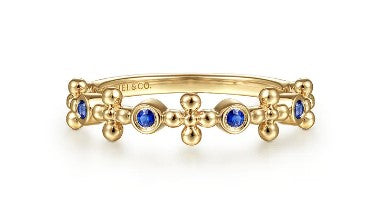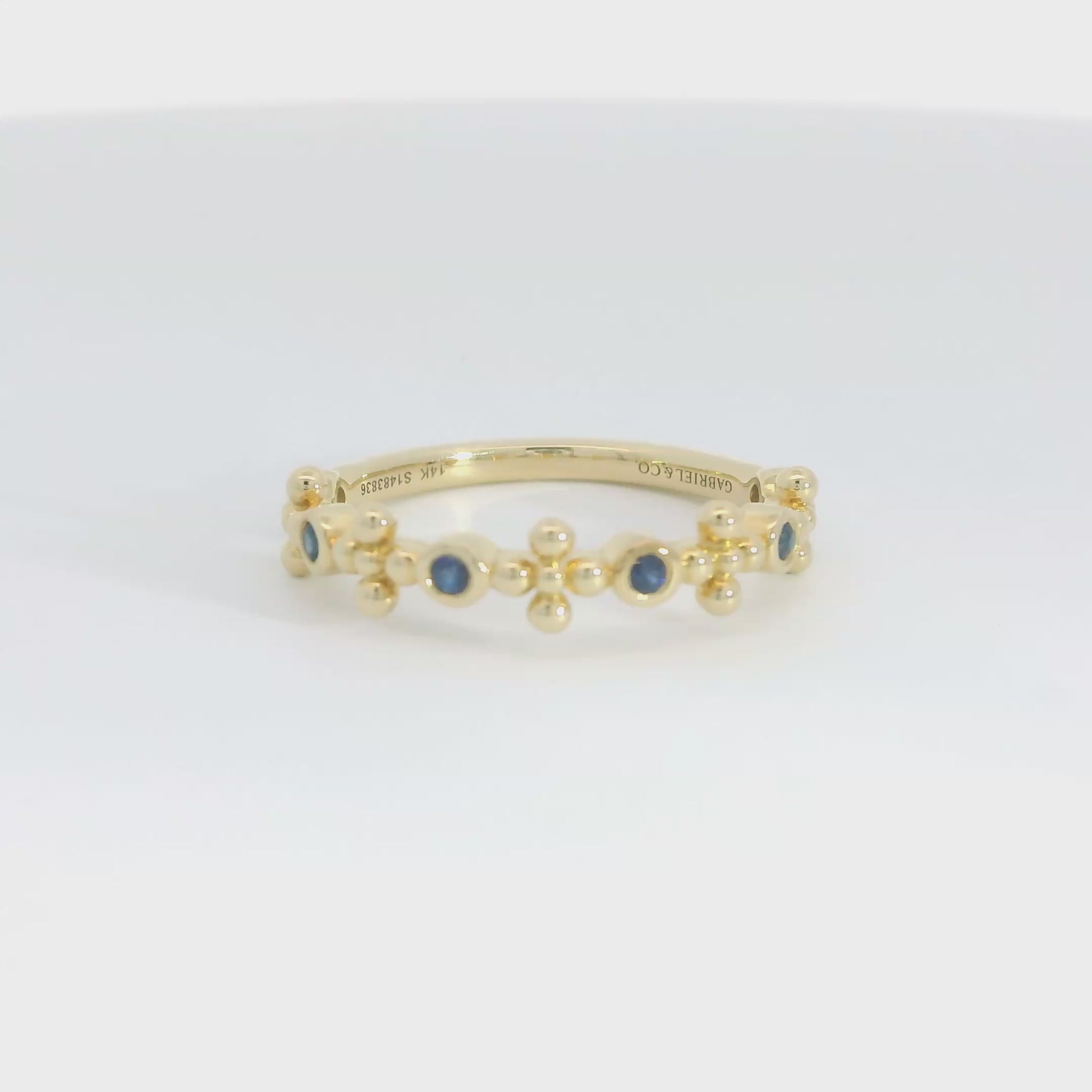 This exquisite gold ring features a delicate band adorned with deep blue sapphires, each set between lustrous golden beads. Its minimalist yet luxurious design makes it perfect for both everyday wear and special occasions, adding a touch of elegance to any outfit. This beautiful ring can be worn on its own or stacked with other rings. The ring is made in 14K yellow gold and features 0.09tw of blue sapphires. Gabriel & Co. # LR51918Y4
