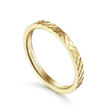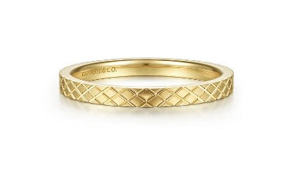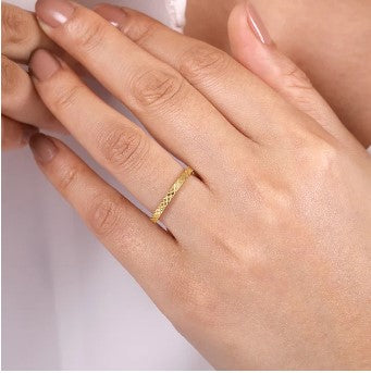 This exquisite gold ring features a delicate crisscross pattern, adding a touch of sophistication to any outfit. Its minimalist design makes it perfect for both everyday wear and special occasions. Crafted with precision, this piece is an essential addition to your jewelry collection. This beautiful 14K yellow gold ring can be worn on its own or stacked with other rings. Gabriel & Co. # LR51941Y4JJJ