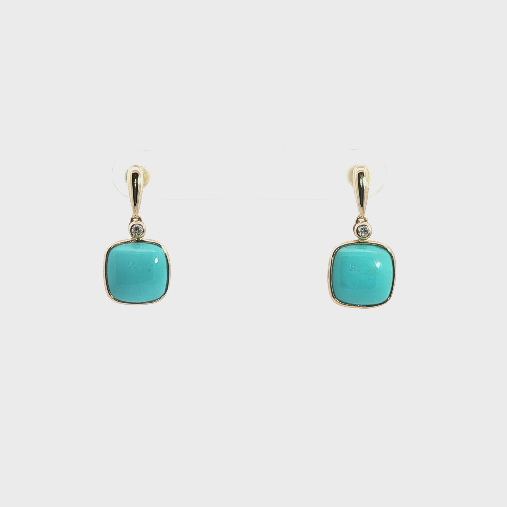 These 14K yellow gold drop earrings feature two 10mm cushion-cut turquoise stones, accented by a total of 0.06 carats of diamonds for refined elegance.