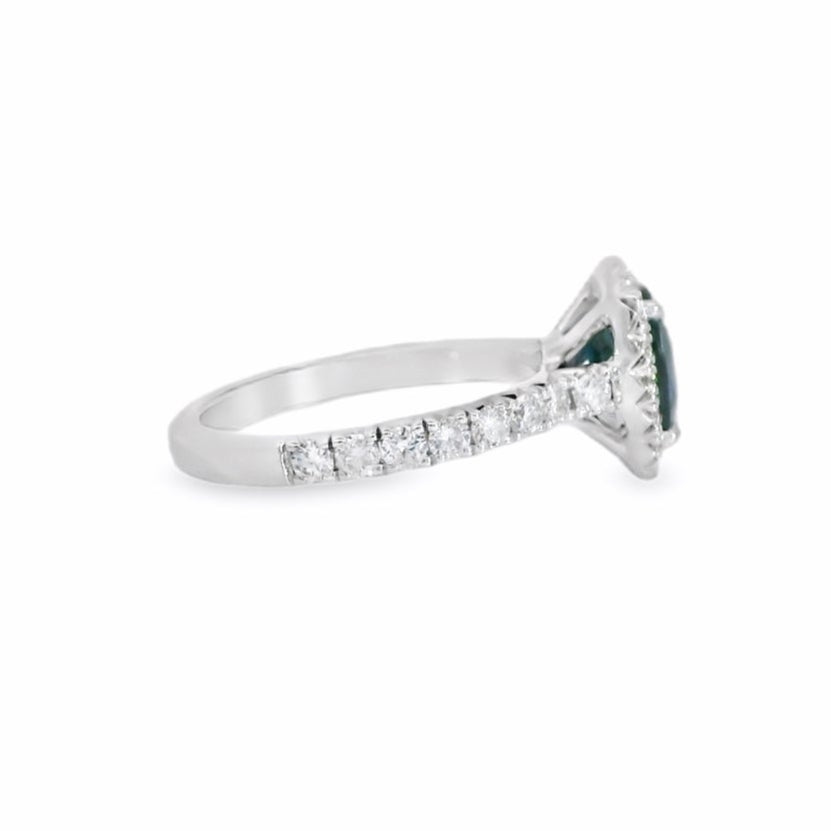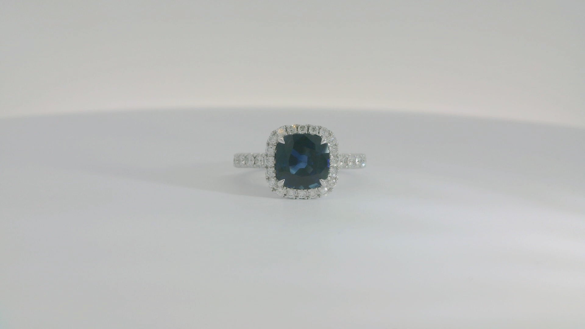 This elegant 18K white gold ring highlights a stunning 2.63ct cushion-cut blue sapphire with a rich royal blue color. Accented by 0.77ct total weight of natural diamond melee, the mixed-cut sapphire serves as a striking centerpiece. This multistone design embodies classic sophistication, making it an ideal choice for those seeking refined luxury for any special event. The Sapphire is certified by the Bellerophon Gemlab. Report #B7752