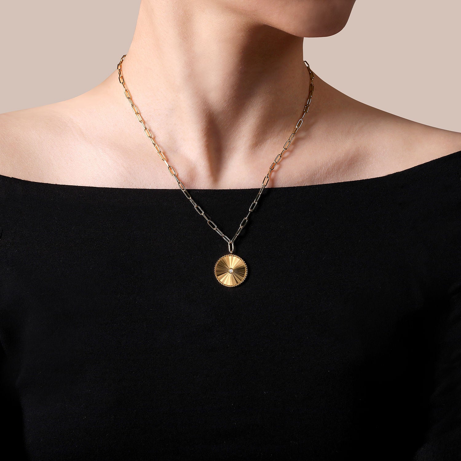Elevate your wardrobe with the Diamond Cut necklace. Crafted in 14K yellow gold, it features a dazzling 0.05ct diamond set in a textured medallion pendant. Measuring 18 inches in length, the paperclip chain is adorned with Bujukan beads for a touch of elegance. Add a touch of sophistication to any outfit with this versatile piece.