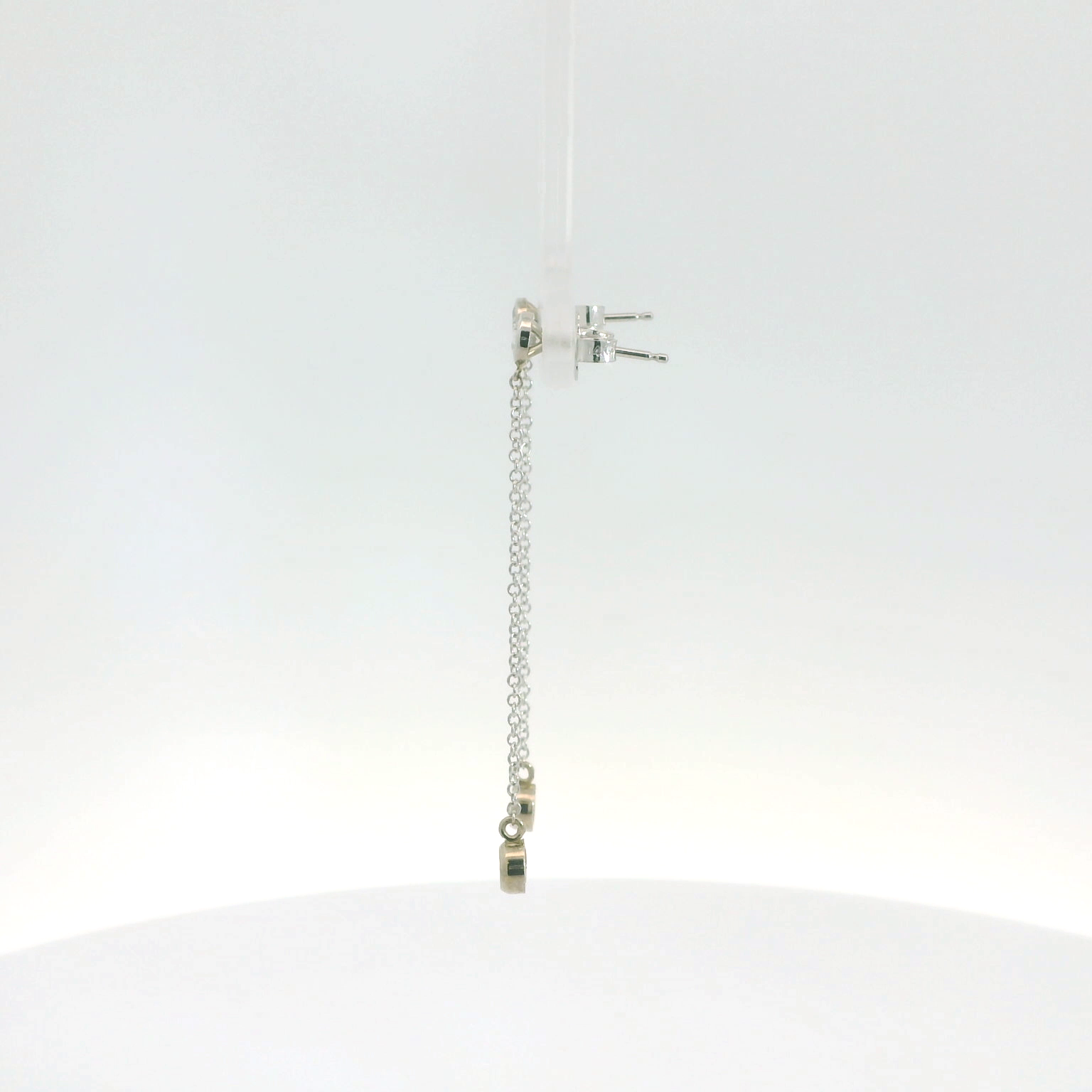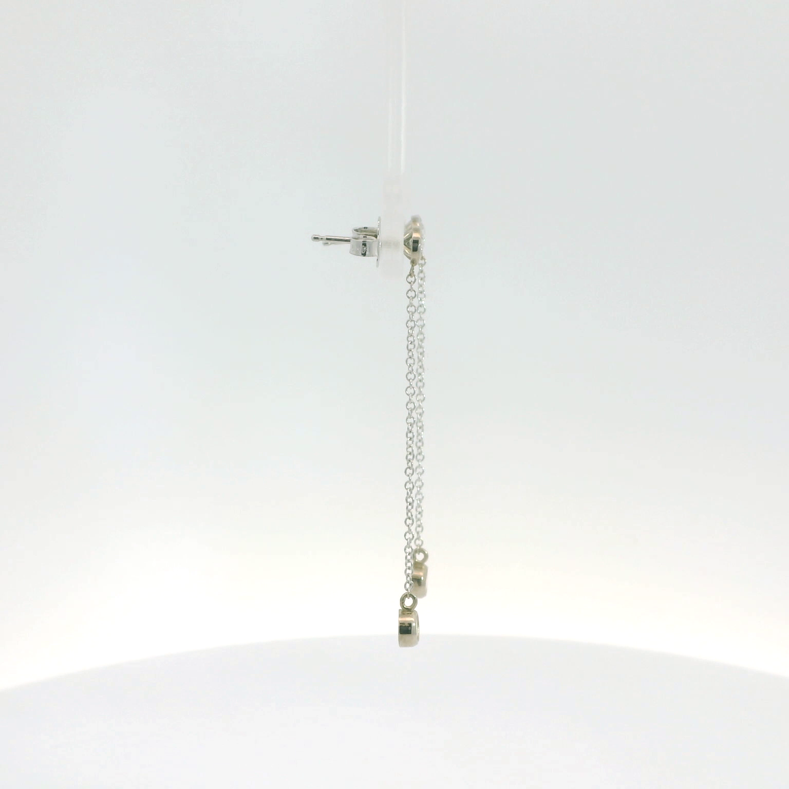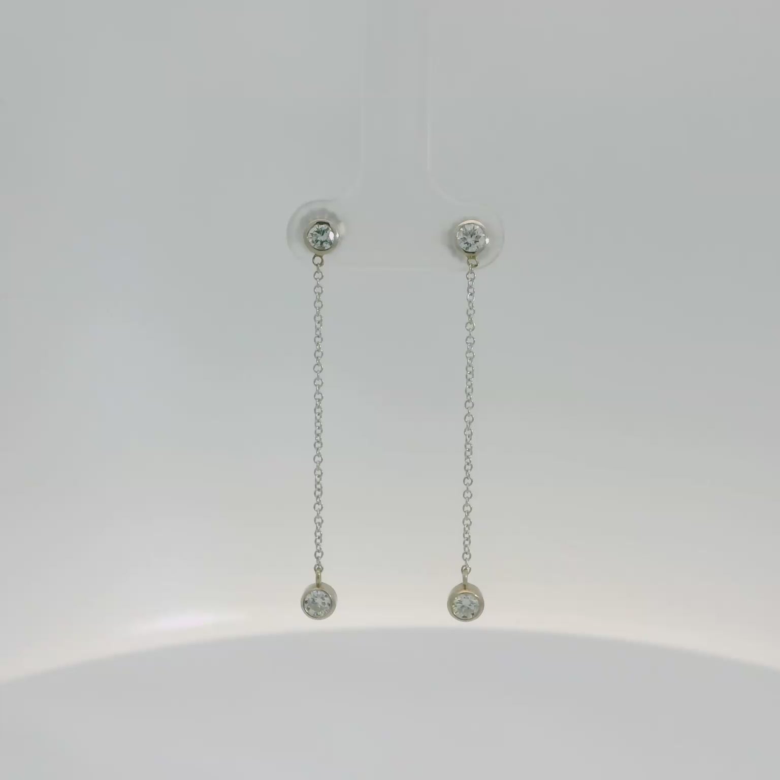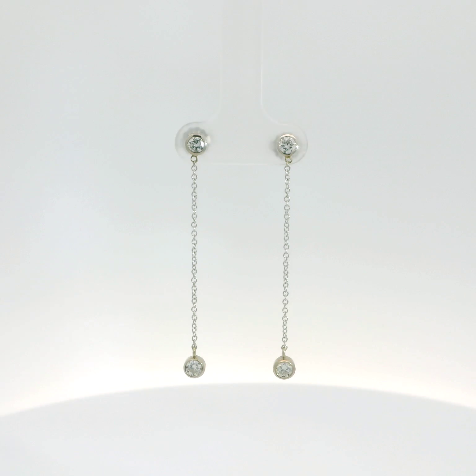 These elegant drop earrings feature a minimalist design with delicate chains and sparkling bezel set diamonds. Perfect for adding a touch of sophistication to any outfit, they are ideal for both everyday wear and special occasions. These beautiful earrings are made in 14K white gold and feature 0.55tw of natural diamonds