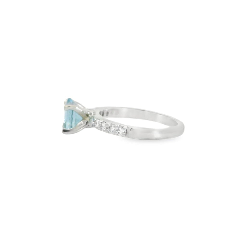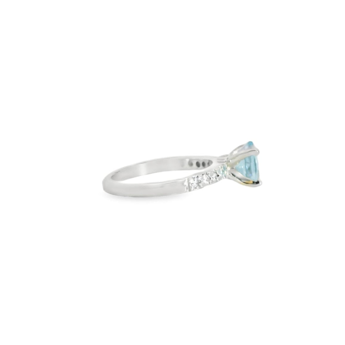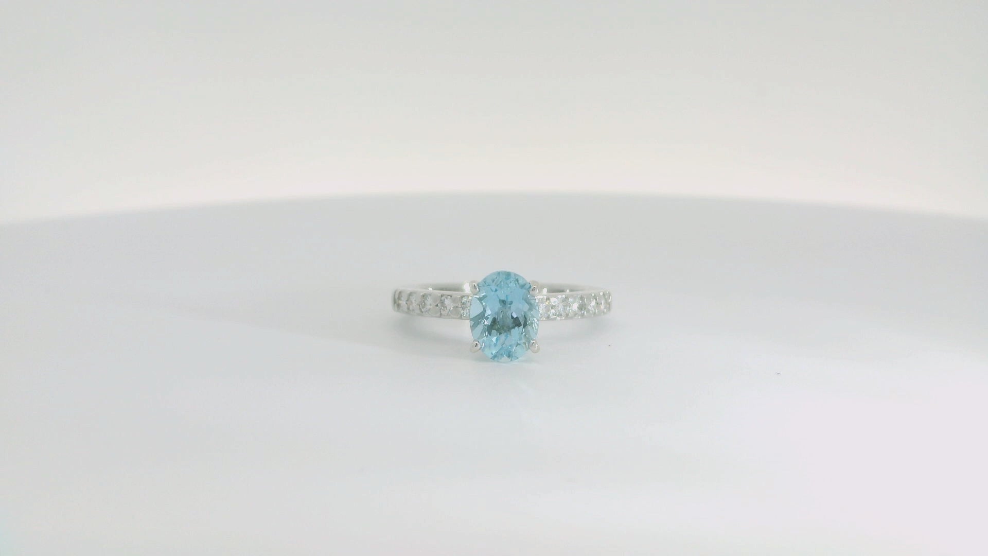 This platinum ring showcases a stunning 1.22ct oval aquamarine paired with 0.30 total carat weight of natural diamonds. The light blue aquamarine offers a calming, ethereal beauty, enhanced by excellent cut, polish, and symmetry for an elegant, smooth finish. A refined piece, this ring makes a distinguished addition to any fine jewelry collection.